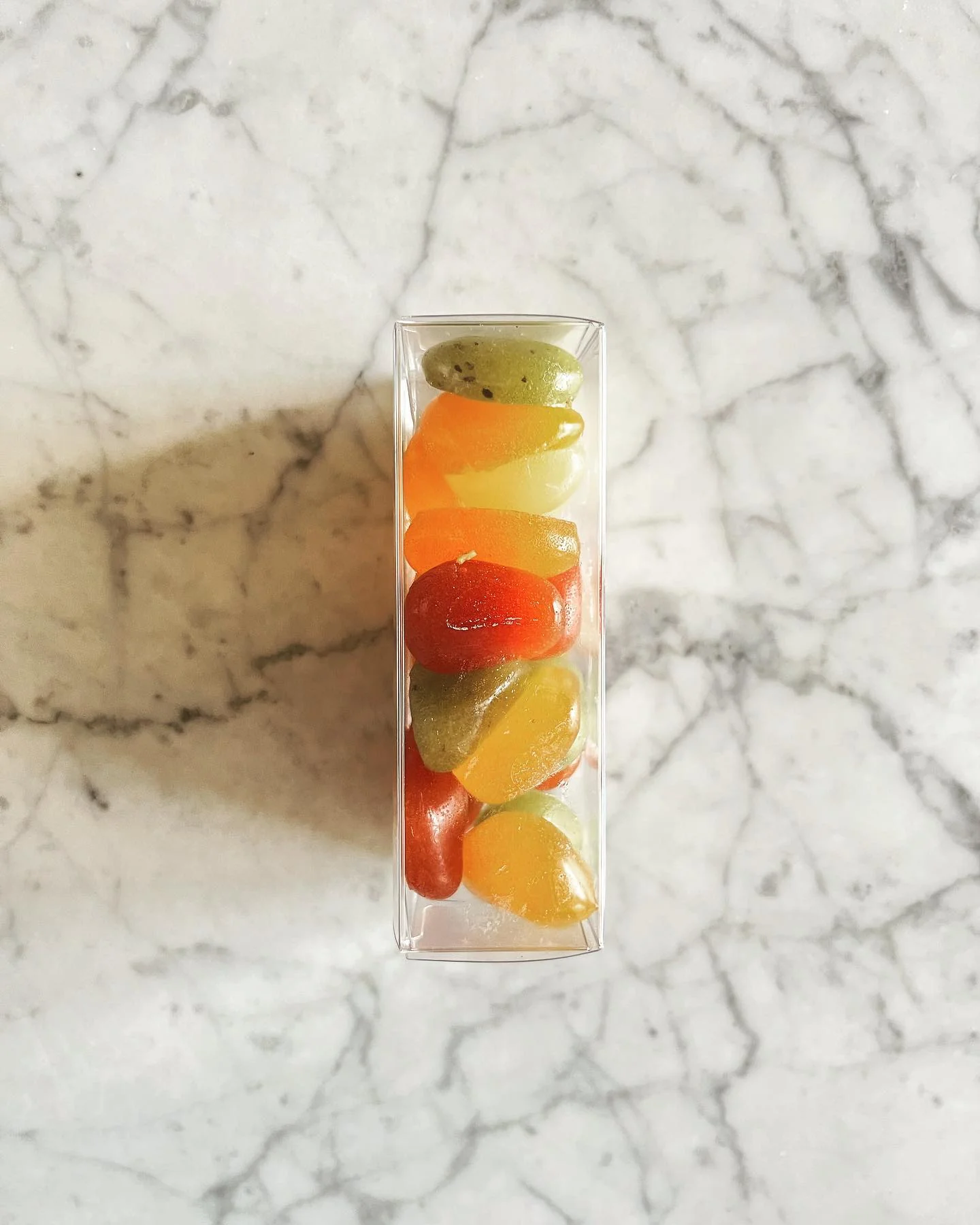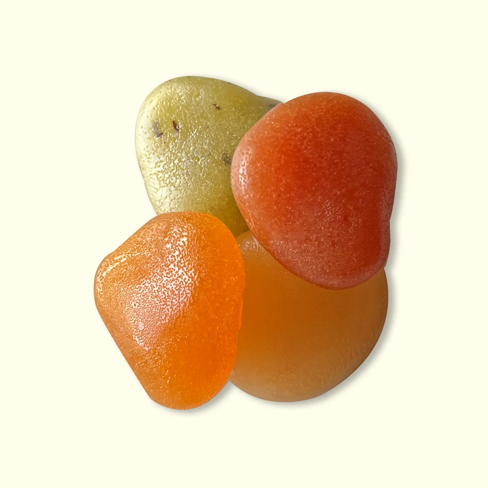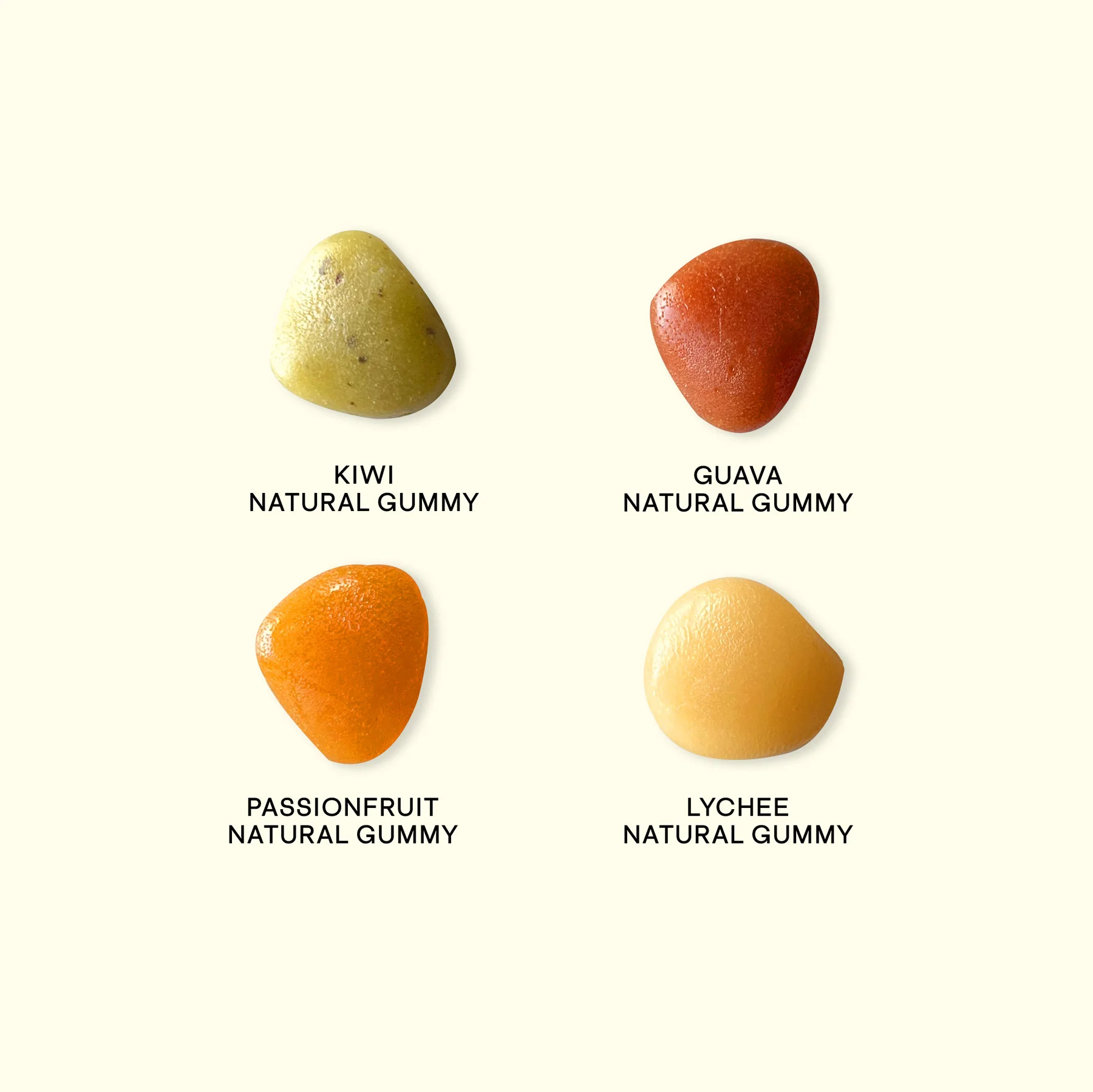 A pack of 12 natural gummies in an assortment of bright and tropical fruit flavors. Made with all natural fruit, no added colors or flavoring, and naturally gluten-free.